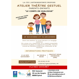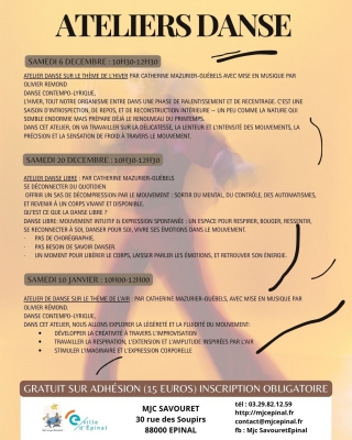 3 ateliers danse proposés et animés par Catherine GUEBELS-MAZURIER sur le thème de l'hiver, danse libre et sur le thème de l'air Inscription obligatoire, gratuit sous adhésion (15€)