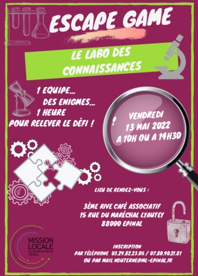Escape Game organisé par La Mission Locale d’Épinal. Le labo des connaissances. 1 équipe … des énigmes … 1 heure pour relever le défi ! Deux possibilités, à 10h ou à 14h30. Inscription par téléphone 03.29.82.23.05 / 07.80.90.21.81 ou par mail nduterne@ml-epinal.fr . Ouvert à tous les jeunes de 16 à 25 ans. Gratuit. Pot offert.