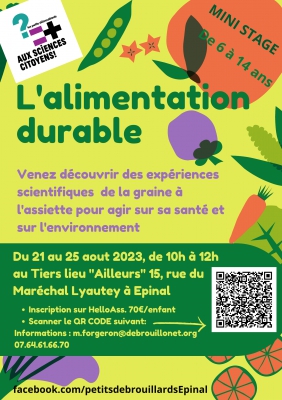 Des vacances à la sauce petits débrouillards : des questionnements en tout genre, un tourbillon d’expériences ludiques et scientifiques pour passer une semaine pas comme les autres ! Ce mini-stage sera le théâtre d’expériences et de jeux autour de l'alimentation durable ! De la graine à l'assiette, venez découvrir comment et pourquoi l'alimentation joue un rôle sur l'environnement et sa santé! Pour les enfants de 6 ans à 14 ans.