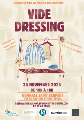 Nous organisons un vide-dressing solidaire le dimanche 23 novembre 2025, de 10h à 18h, au Gymnase Saint-Exupéry, rue du Haut Étages à Épinal.