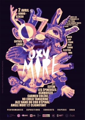 Jazz Band du Conservatoire d’Epinal/ 2T rap / No Child Tangerine – Indie Rock / Les Épineuses – Drag / Angle mort et clignotant – rap et électro / Carmen en Colère – punk et rock / Ashnoiser – teckno livre / Elyem – DNB